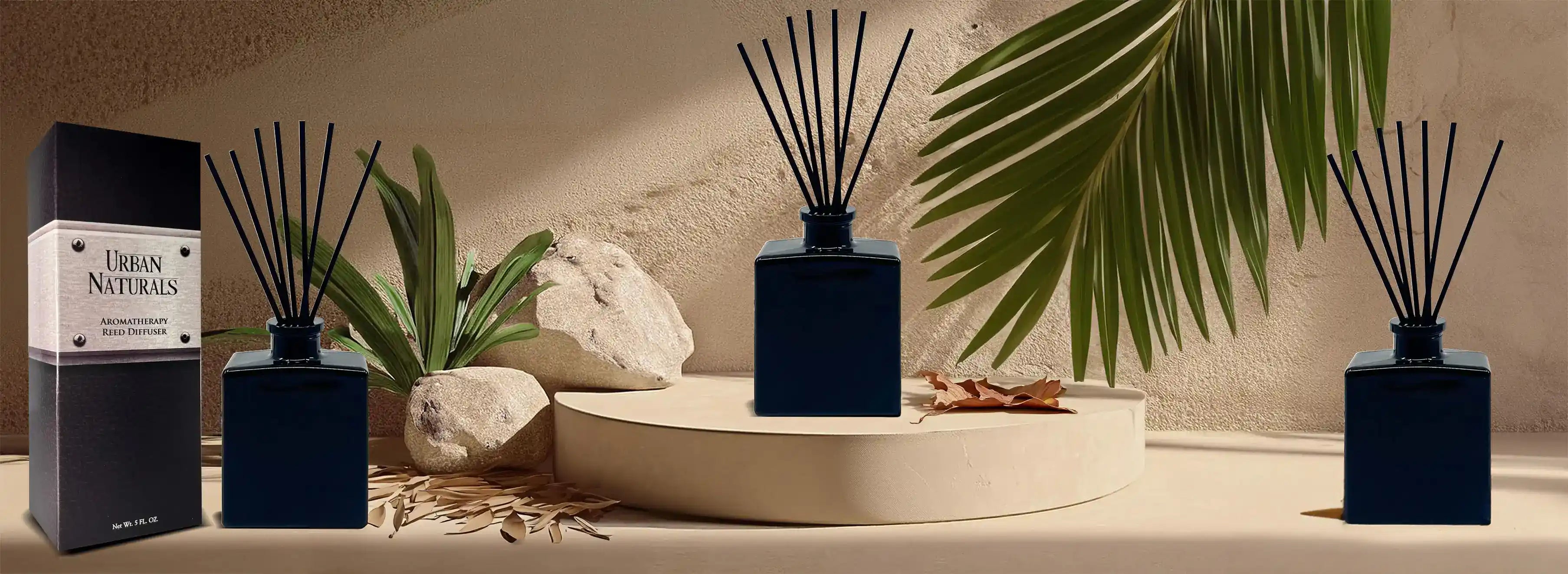 The Urban Modern Black Collection features bold, black rectangular bottles that exude sleek sophistication. Designed to hold premium reed diffuser oil, this collection is perfect for those who want the best reed diffuser to make a statement while filling their space with enduring, luxurious fragrances.