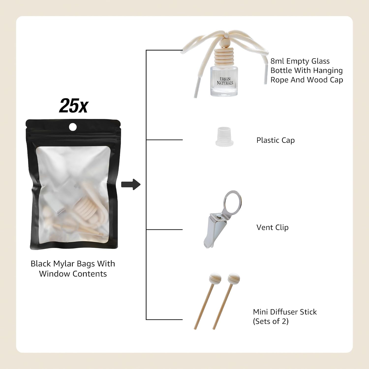 ALL-INCLUSIVE SET: 25 Bottle Sets with Hanging Rope, Vent Clips, Diffuser Sticks, Fragrance & More.